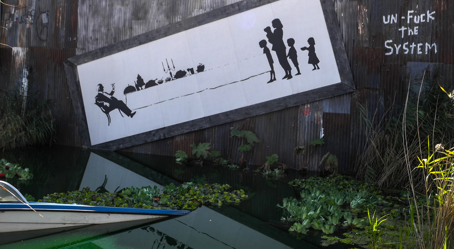 Dismaland, the 'family theme park unsuitable for children', was a temporary art project organised by Banksy in Weston-super-Mare, England. It was an incredible exhibition, with works by 58 artists including Damien Hirst, Ronit Baranga, Dietrich Wegner, Jenny Holzer and Jimmy Cauty. Banksy created a dystopian bemusement park which reflected the injustice, exploitation and inequality of modern society.