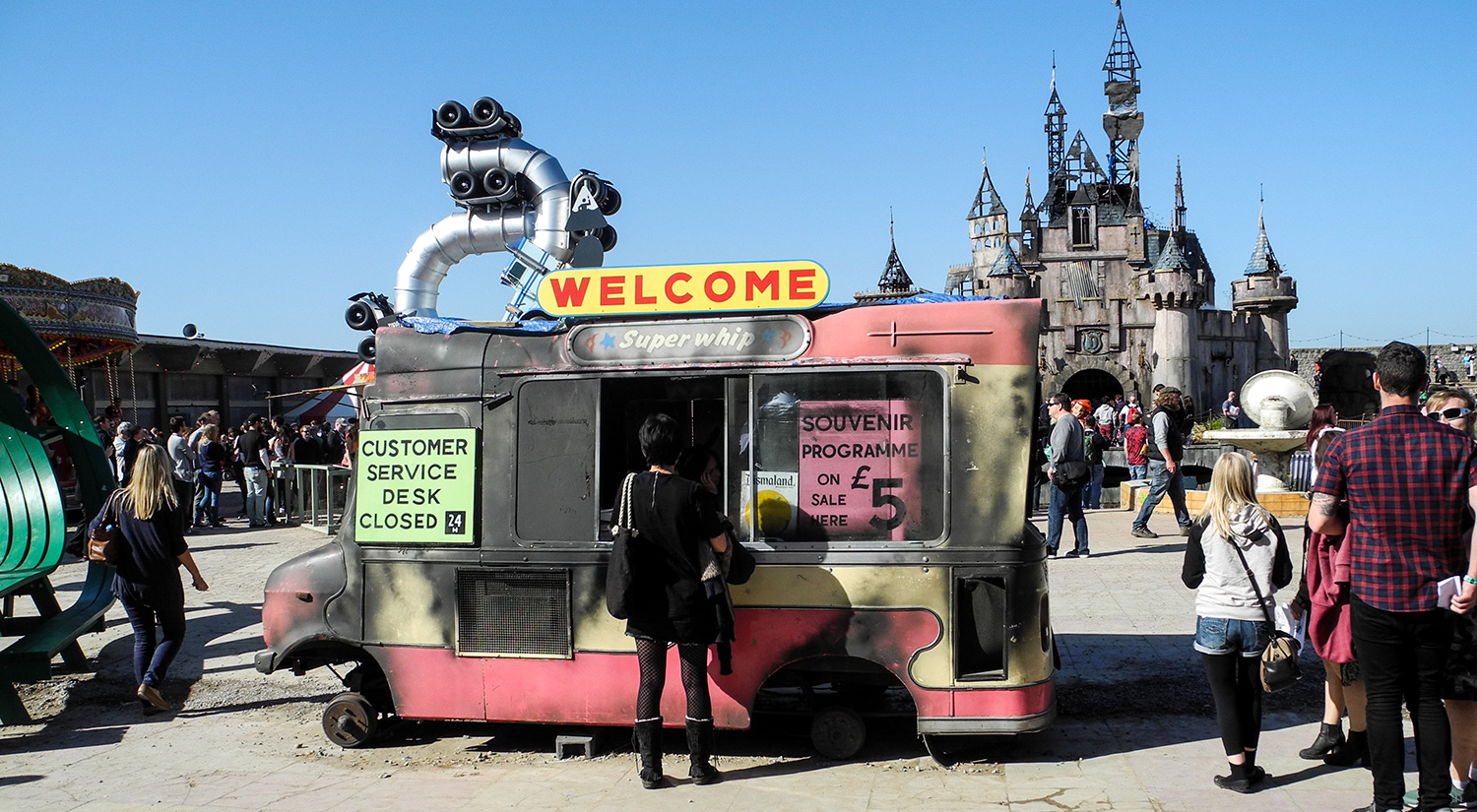 Dismaland, the 'family theme park unsuitable for children', was a temporary art project organised by Banksy in Weston-super-Mare, England. It was an incredible exhibition, with works by 58 artists including Damien Hirst, Ronit Baranga, Dietrich Wegner, Jenny Holzer and Jimmy Cauty. Banksy created a dystopian bemusement park which reflected the injustice, exploitation and inequality of modern society.